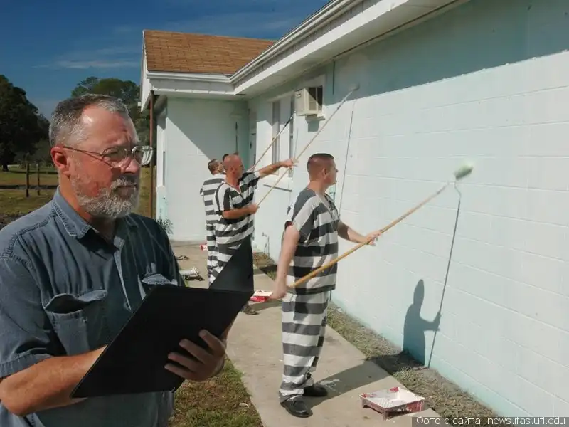 Заключенные тюрьмы на северо-востоке штата Флорида, США, красят стены одного из зданий, принадлежащих университету Флориды. Полосатая форма — это классический вариант одежды для заключенных. Столь необычное одеяние объясняется двумя причинами. Во-первых, такая одежда облегчает поимку сбежавшего — она хорошо заметна для тех, кто ловит беглеца, а местные жители, увидев его, сразу понимают, что это именно бежавший заключенный, а не вышедший прогуляться турист. Во-вторых, необходимость носить необычную и одинаковую для всех заключенных одежду оказывает определенное психологическое влияние, подавляя волю и отделяя заключенных от свободных людей. Впрочем, до первой половины XIX века заключенных никто спецодеждой не обеспечивал. Кое-где так было и в начале ХХ века.