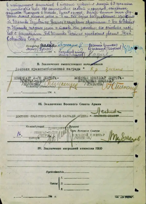 атаки противника, воодушевляя бойцов своего подразделения. По выбытию из строя командира пулеметного взвода, тов. Шрамко 18.12.1941 г. принял на себя командование взводом. Немецкие фашисты двинули на подразделение тов. Шрамко силы, в несколько раз превосходившие число бойцов пулеметного взвода. Дело дошло до гранатного боя. Тов. Шрамко бросил в наступавших фашистов в течение нескольких минут 63 гранаты и уничтожил более 100 фашистских солдат и офицеров, остальные фашисты бросились в бегство, бросая оружие. Этим самым была удержана линия обороны роты и батальона. Все бойцы, воодушевленные героизмом тов. Шрамко, беззаветно дрались с немецкими оккупантами. В бою 20 декабря 1942 г. тов. Шрамко был тяжело ранен и только это заставило его оставить поле боя с фашистами…».