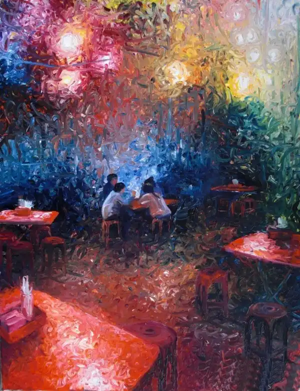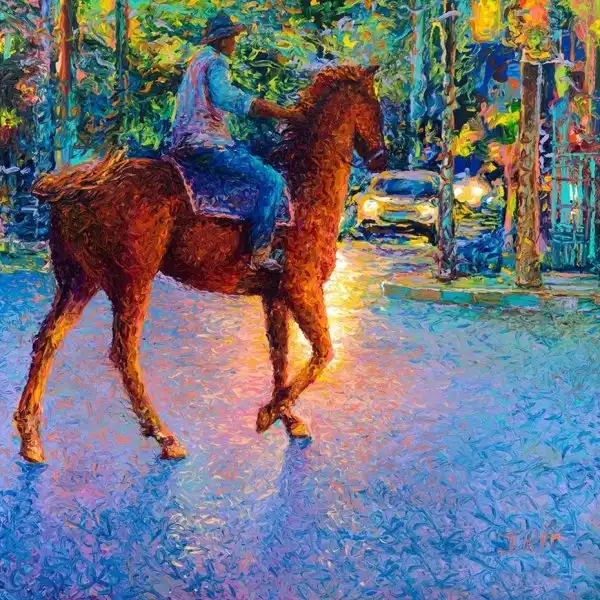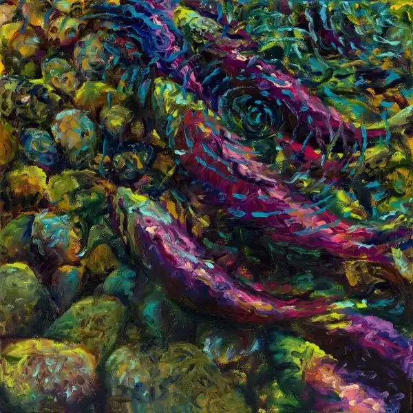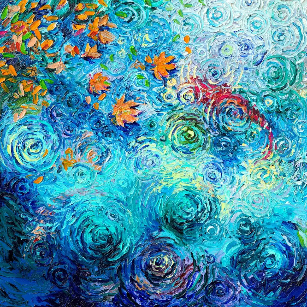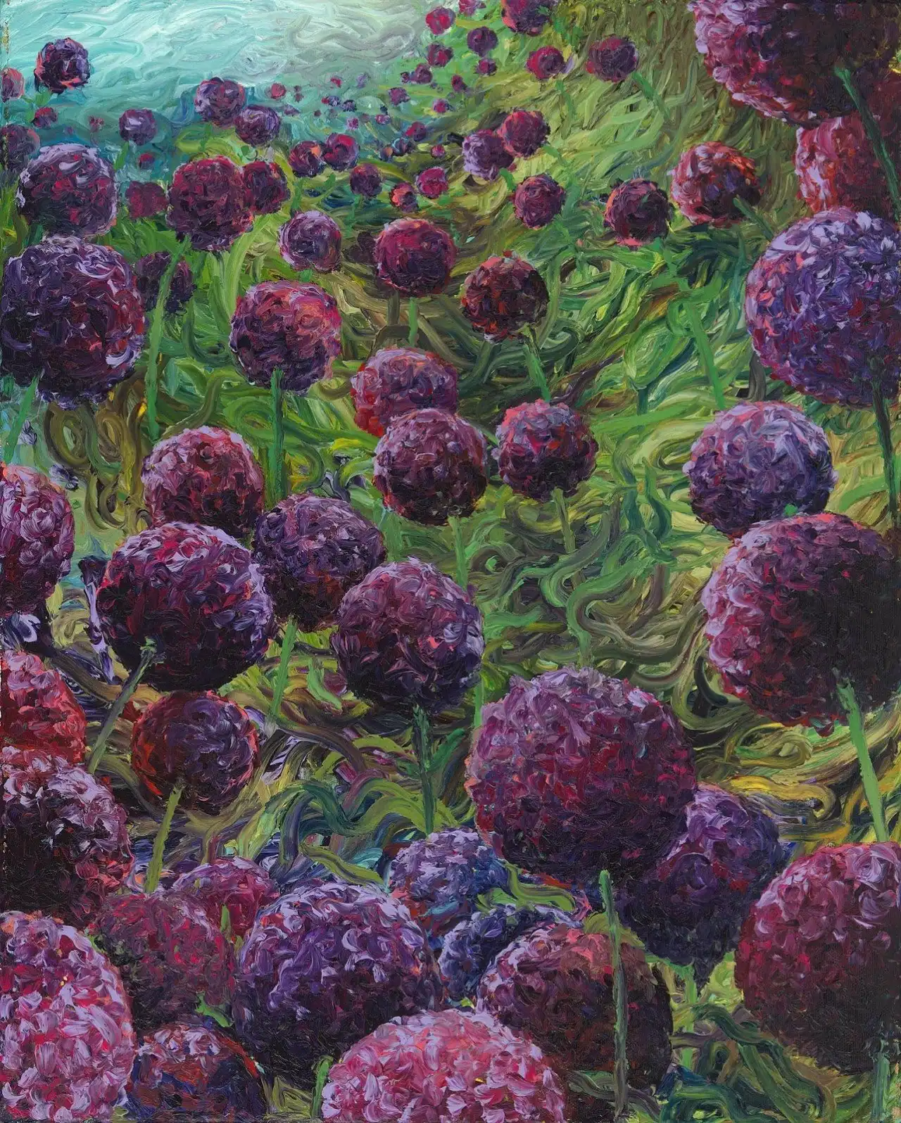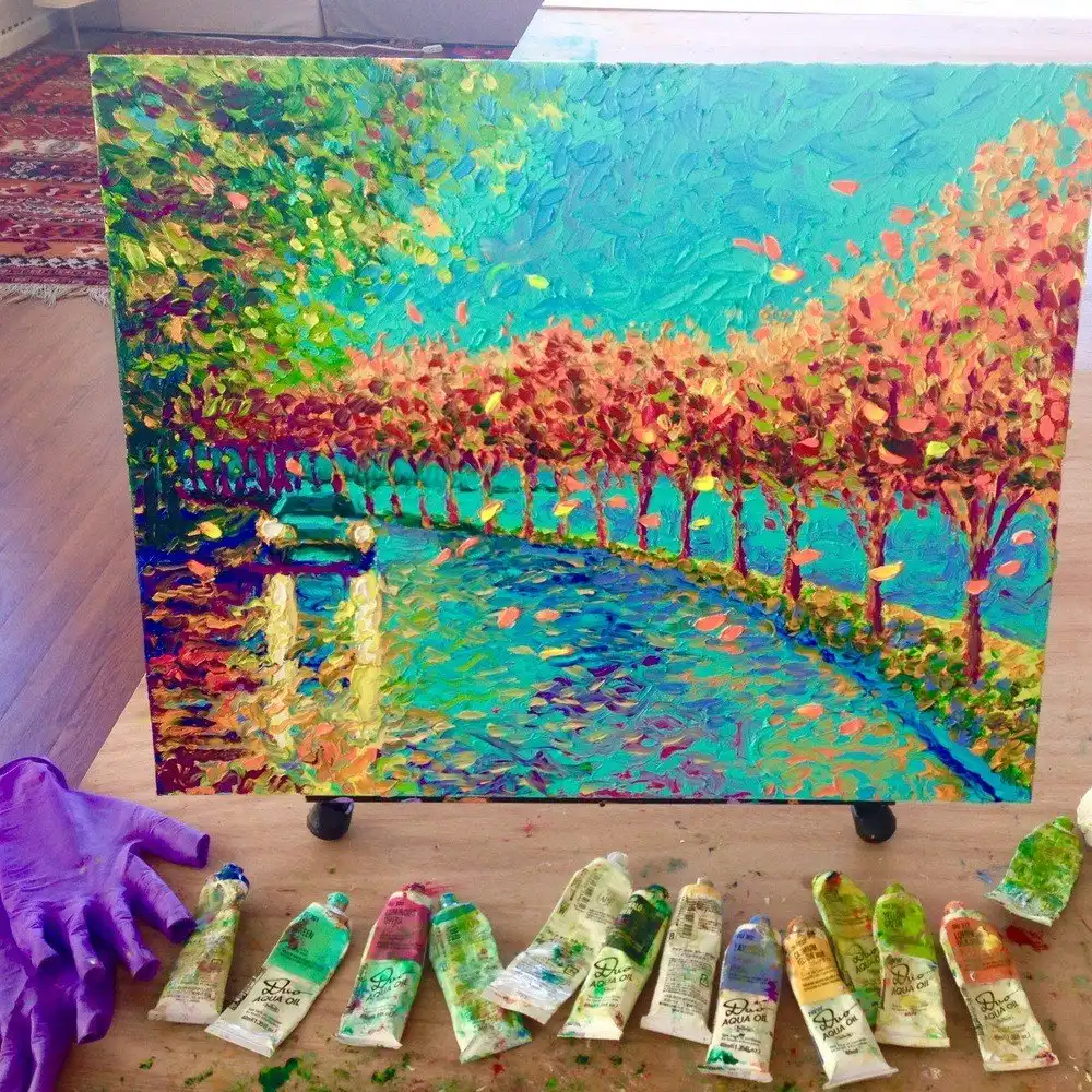 «Новая картина всегда начинается утром с чашкой крепкого кофе в руке. Как и мой стоматолог, я надеваю фиолетовые перчатки из латекса и начинаю работать. Мои пальцы быстро танцуют на холсте — некоторые говорят, что это напоминает им пианиста в действии. Цвета сталкиваются и сливаются в моем сочинении, текстура становится густой и сочной».