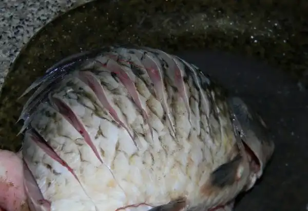 Затем делаем насечку. Для карася это обязательно. У него есть тонкие длинные косточки, которые таким образом, разрезаются и становятся доступны для масла и высокой температуры. Косточки показал стрелками. В общем они размягчаются, прожариваются и становятся почти незаметными. Раньше меня очень отпугивал сам факт наличия этих косточек, но попробовав данный рецепт я решил карасю на моей кухне быть!