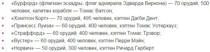 Адмирал Вернон на выступлении в Парламенте пообещал захватить один из портов Новой Гранады «только шестью кораблями», поэтому, верный своему слову, 5 ноября 1739 года вышел с Ямайки в следующем составе:
