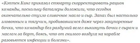 Но этого нельзя было сказать о сливочном масле. И чего только не перепробовали на флоте для увеличения сроков его хранения! Подсоленные куски помещали в соляном растворе в бочках, корабли снабжали топлёным маслом, использовали масло козье и масло овечье – но более месяца-двух хранить его никак не получалось. И очень часто выходило так, как в ситуации, описанной в мемуарах Джеймса Харди Вокса: