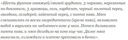 Это один из рецептов приготовления солонины, которым пользовались ещё с XVI века. К XVIII веку было внесено только одно кардинальное новшество: розовая соль. Ее использование придавало солонине красный оттенок, тогда как при использовании обычной соли оттенок был грязно-бурым. Считалось, что солонина становилась приемлемой как минимум после двухлетней выдержки.