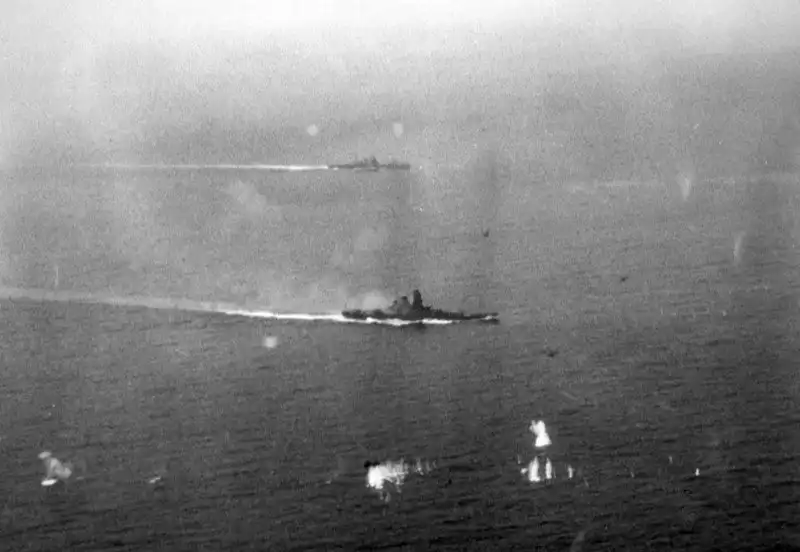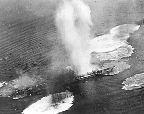 Авианосец «Хирю», благодаря цепкости гидросамолета с «Тоне», который преследовал соединение Флетчера, постоянно радируя его координаты, сумел отомстить, двумя последовательными атаками повредив «Йорктаун» 3 бомбами и 2 торпедами (в левый борт). Пылающий корабль с заклиненным рулем и 26-градусным креном был оставлен экипажем, а его самолеты стали садиться на «Энтерпрайз» и «Хорнет».