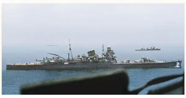 Крейсер «Тикума» на заднем плане и линейный корабль «Ямато»