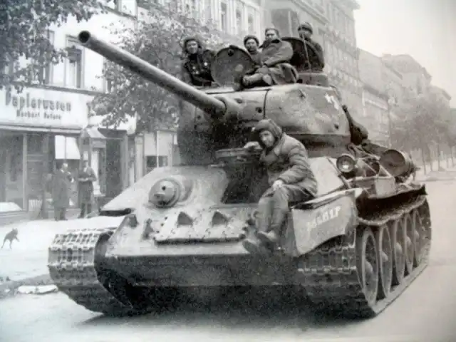 Советский танк Т-34-85, подбитый на улице Берлина.