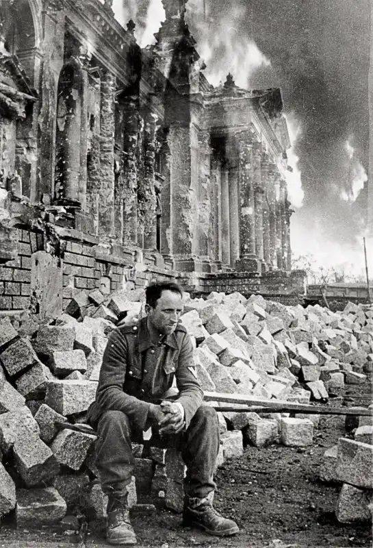 Пленный немецкий солдат сидит у Рейхстага.