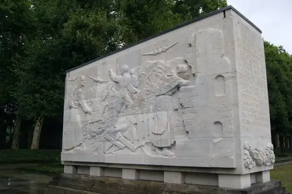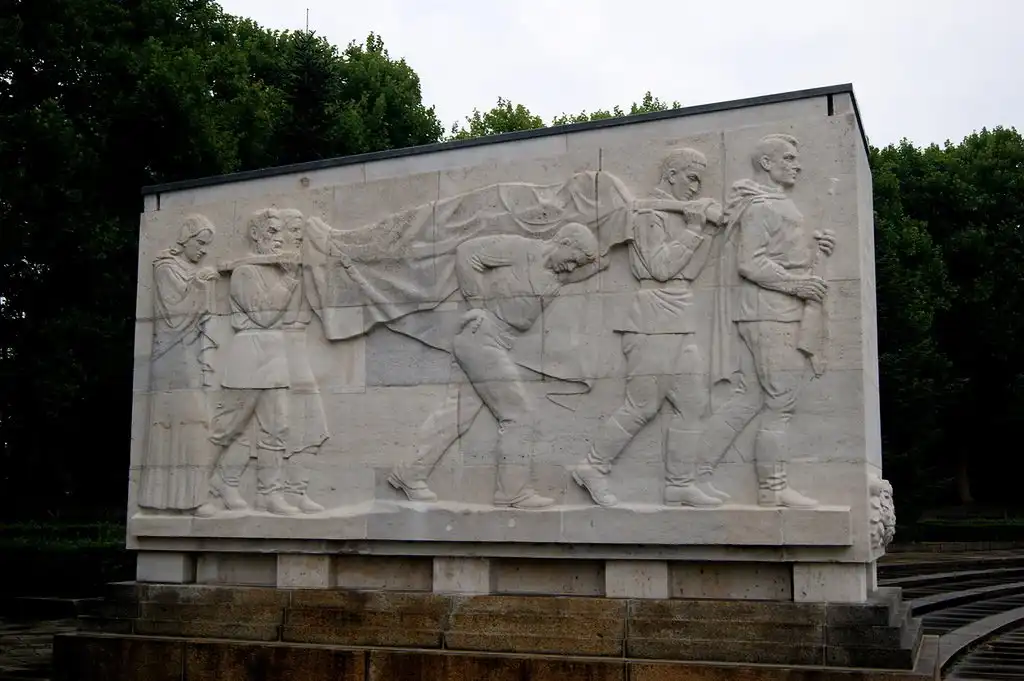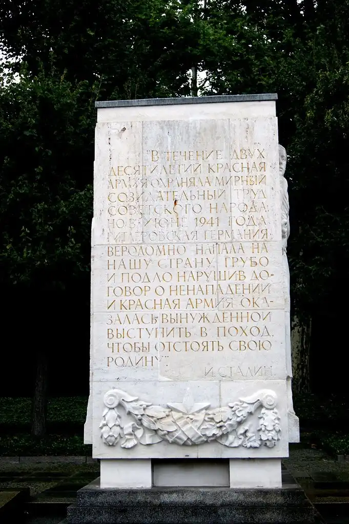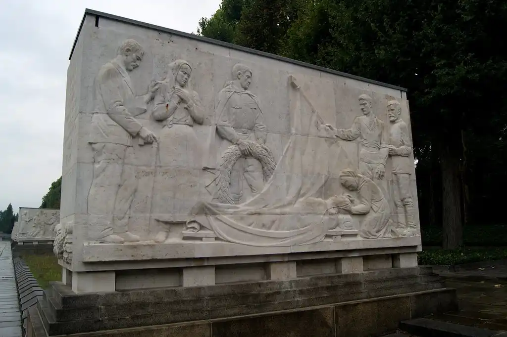 Вплоть до памятника слева и справа стоят памятные камни с барельефами описывающими подвиг Советского народа в борьбе с нацизмом и фашизмом, снабженные цитатами из речей Сталина посвященых Великой Отечественной войне, каждая цитата соответствует изображениям. Слева все камни с русским текстом, справа на немецком. Далее смотрим без комментариев и так все понятно.
