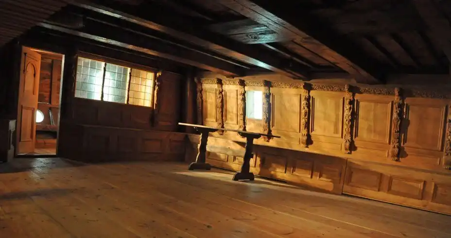 О внутреннем убранстве «Вазы» позволяет судить павильон, построенный в музее. Перед нами «большая камера», предназначенная для размещения старших офицеров корабля. Позади неё находится вход в капитанскую каюту. Стены каюты украшены деревянными панелями и резными украшениями более простого вида. Посередине находится стол, вдоль стен лавки и откидные койки.