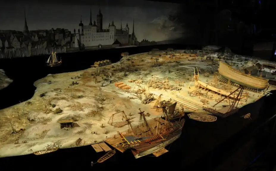 Стокгольмская верфь в XVI–XVII вв. находилась на современной набережной Ниброкаен. Здесь находились склады для древесины, кузнечные мастерские, 2 мельницы и бараки для сотен рабочих. На макете представлено несколько кораблей в разной стадии постройки. Один из них, полностью готовый, проходит ремонт днища. Верхняя часть его мачт и реи сняты, как это делалось, когда корабль ставился на ремонт. Далее видны два других корабля на разных стадиях постройки. Вдалеке виден силуэт Гамластана и королевского дворца Трекронур.