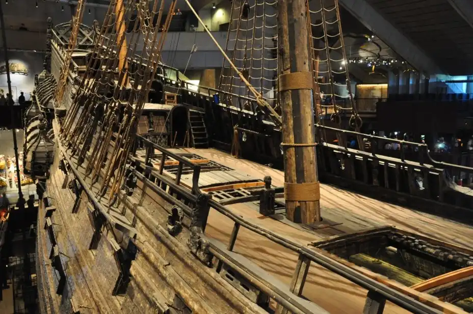 Вид на корпус «Вазы» с кормы на нос позволяет оценить размеры корабля. Оригинальная палуба не сохранилась. Та, что мы видим сегодня, является современной реконструкцией. Частично сохранились фок и грот-мачты. Бизань, которую мы видим на корме, пришлось изготовить заново.
