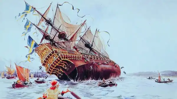 Выбрав якорь и отдав швартовы, «Ваза» с поставленными топселями отошел от причала. Потом корабль, расправя белоснежный наряд новых парусов, плавно двинулся в сторону острова Беккхольмен. По обычаю того времени корабль произвел из всех своих пушек салют двумя залпами. В ответ раздались залпы береговых батарей и крики «Виват! Виват! Бог хранит короля!» На какое-то мгновение корабль окутался густыми клубами порохового дыма. Когда дым унесло ветром, стоявшие на набережной люди замерли от неожиданного зрелища — внезапно корабль стал крениться на левый борт и лег мачтами на воду. Над толпой пронеслись крики ужаса... Не прошло и минуты, как на месте, где только что был корабль, виднелись лишь верхние стеньги с развевающимися на ветру парусами, штандартами и длинными цветными вымпелами. Через несколько секунд и они скрылись в свинцовых волнах Балтики, а в водовороте закружились какие-то бочки, доски и вынырнувшие люди...