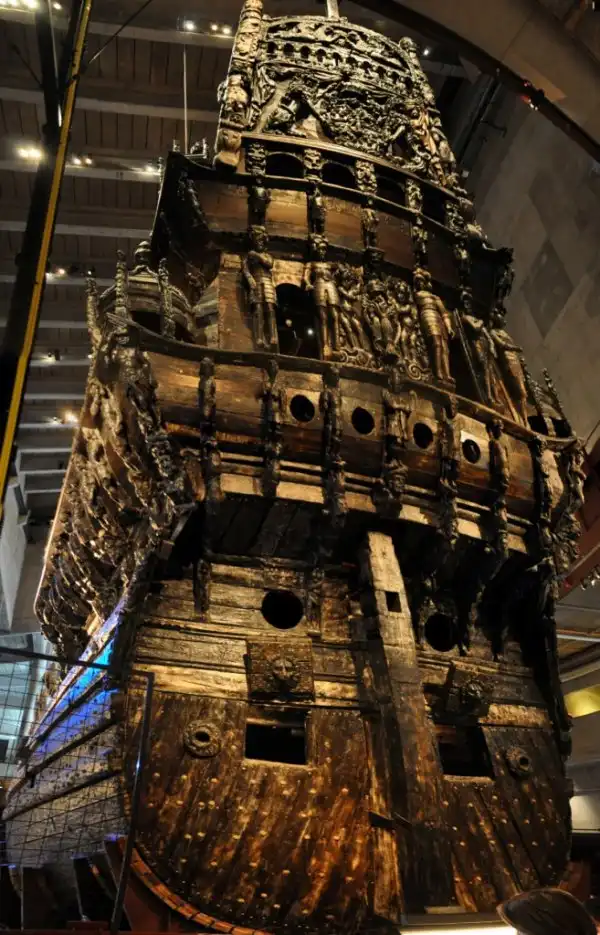 В этом ракурсе хорошо видны детали и резные украшения форштевня корабля. 20 деревянных фигур на бортах-регелях представляют римских императоров от Августа до Септимия Севера, которых Густав II Адольф рассматривал в качестве своих предшественников.