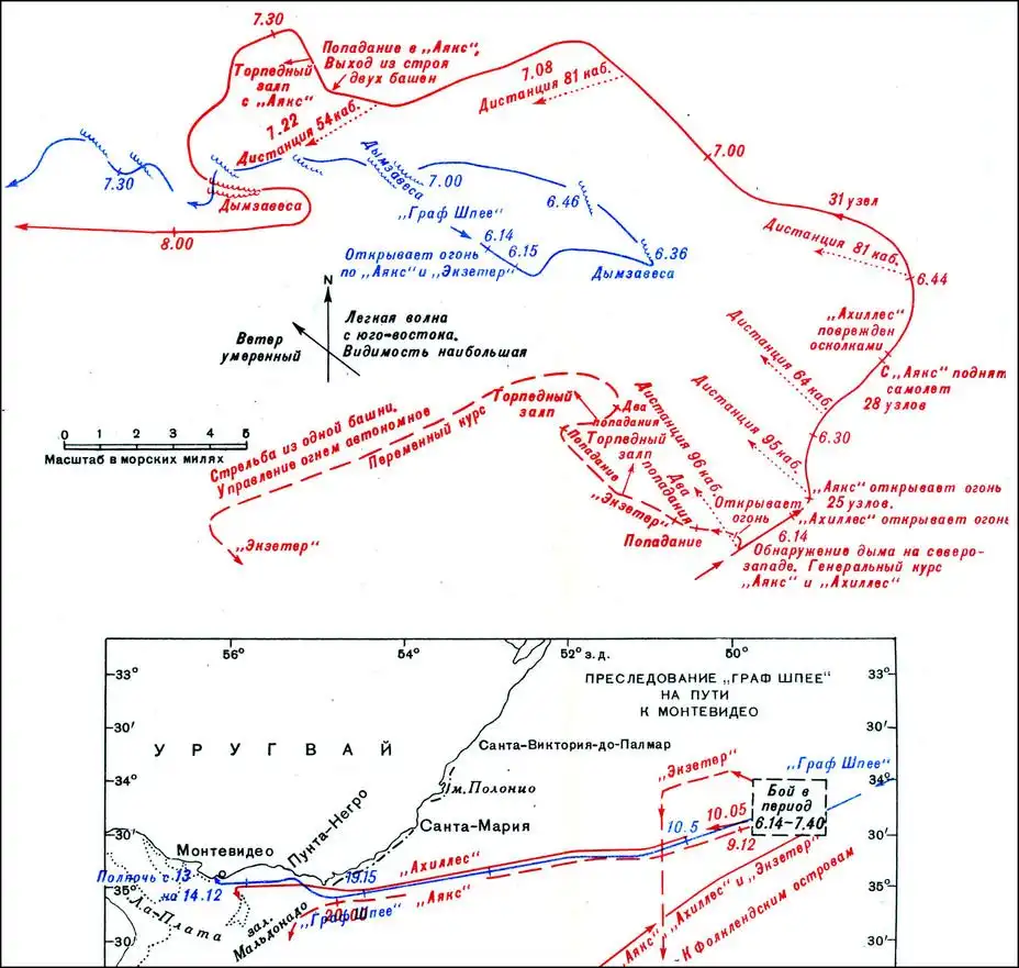 Почти два с половиной месяца «Шпее» и «Дойчланд» вместе с несколькими судами снабжения безнаказанно действовали в Атлантическом и Индийском океанах. Для их поиска англичанам и французам пришлось выделить 3 линейных крейсера, 3 авианосца, 9 тяжёлых и 5 лёгких крейсеров. В конце концов, группа «G» коммодора Генри Хэрвуда (тяжёлый крейсер «Эксетер», лёгкие крейсера «Аякс» и «Ахиллес») перехватила «Шпее» у берегов Южной Америки, недалеко от устья реки Ла-Плата.