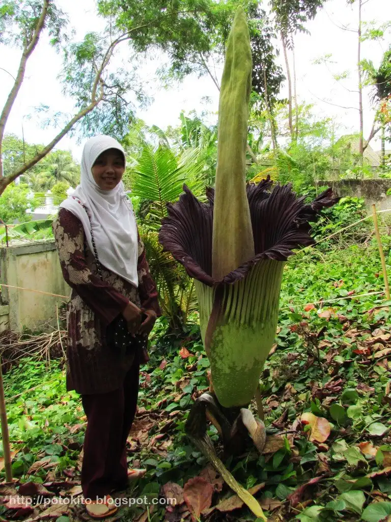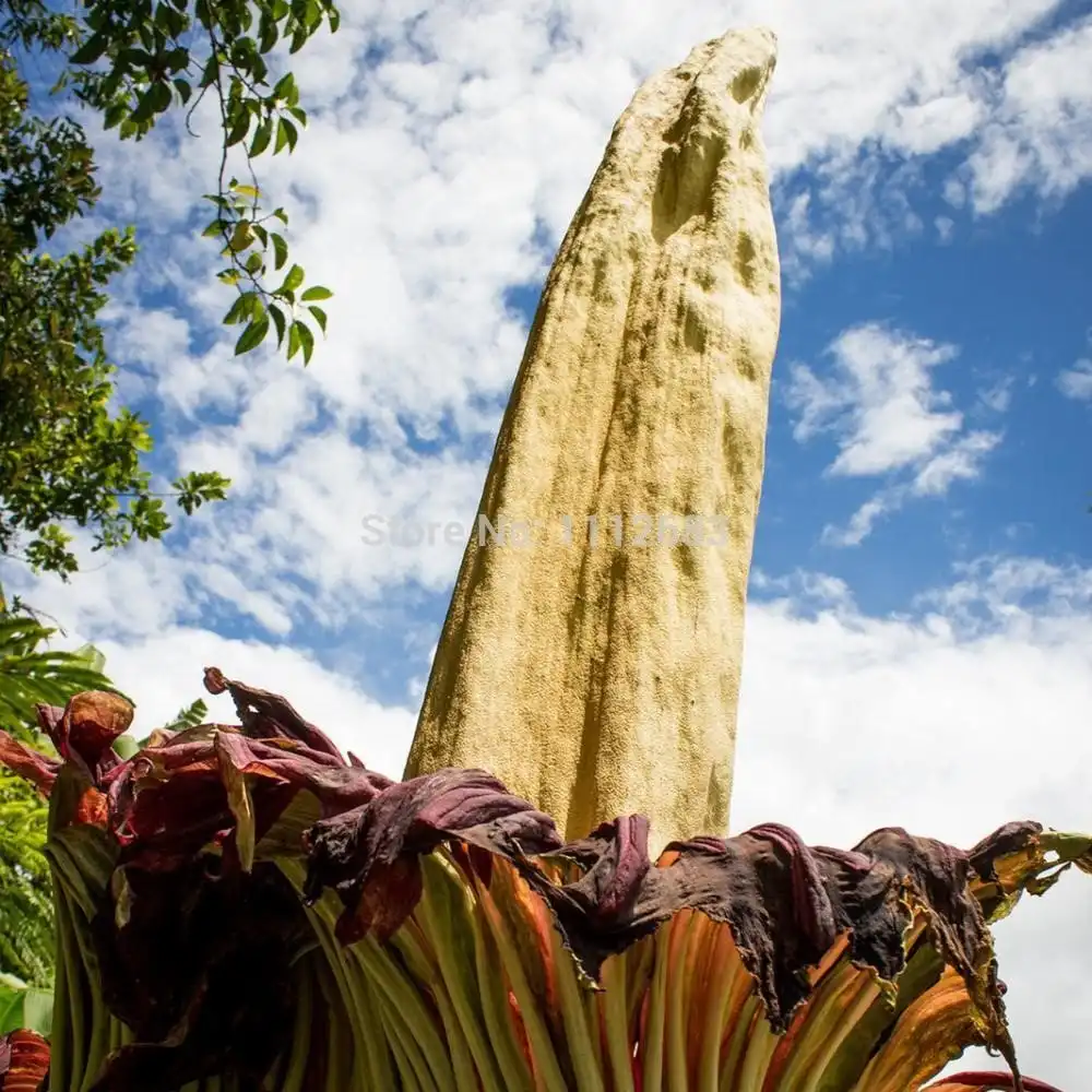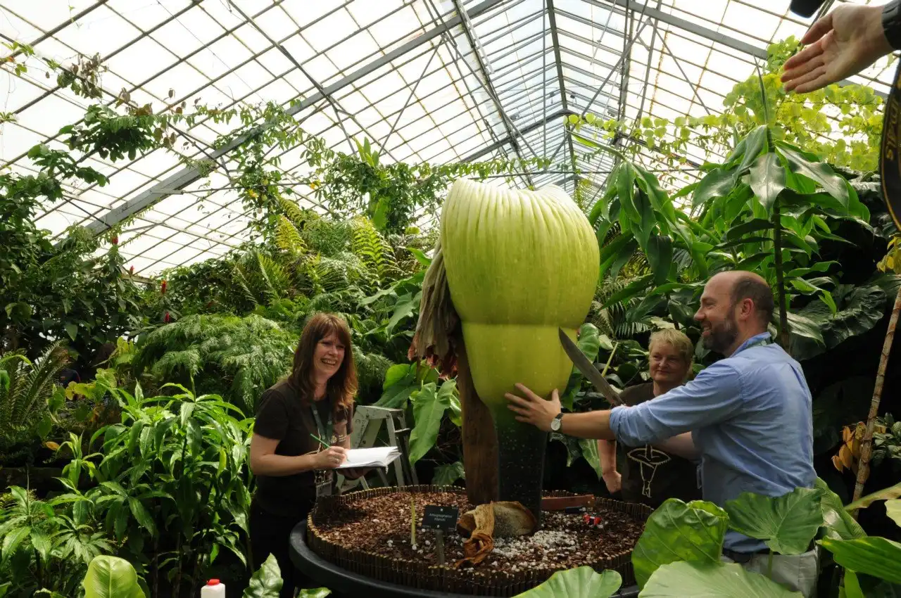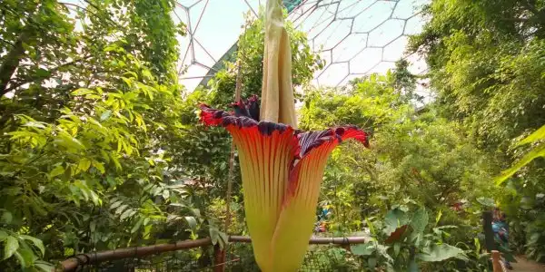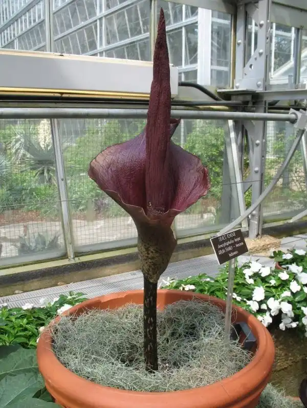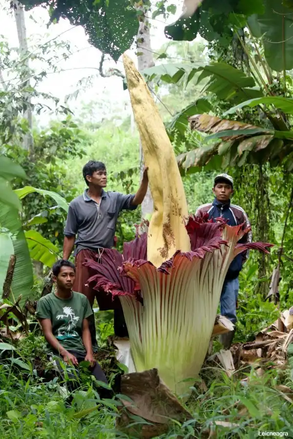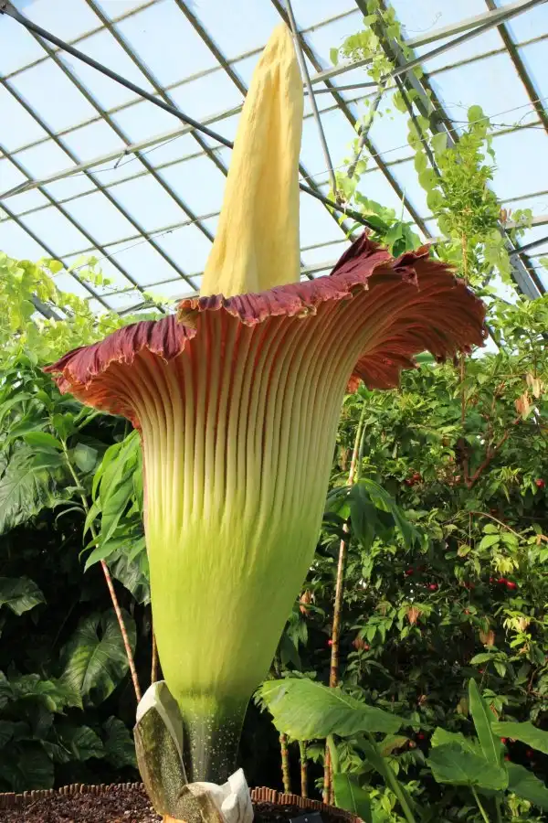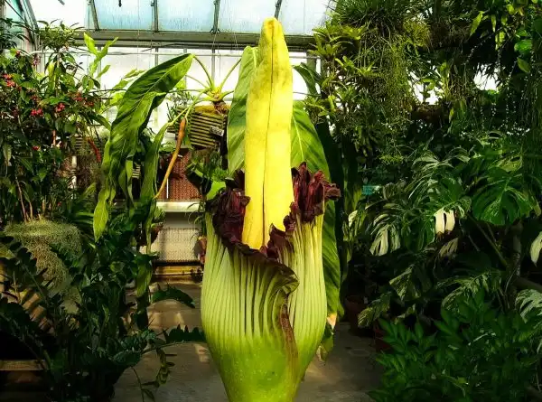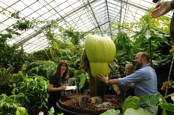 Аморфофаллус гигантский цветет всего два дня и всего пару раз за 40 лет всей своей жизни. В высоту трупный цветок может достигать более 3 м, встречаются образцы с более чем 3 м в диаметре, а самый большой вес клубнелуковиц составляет около 90 кг. Само по себе растение не очень привлекательно, ни на вид, ни на запах.