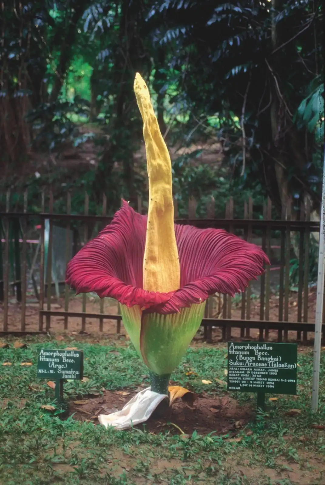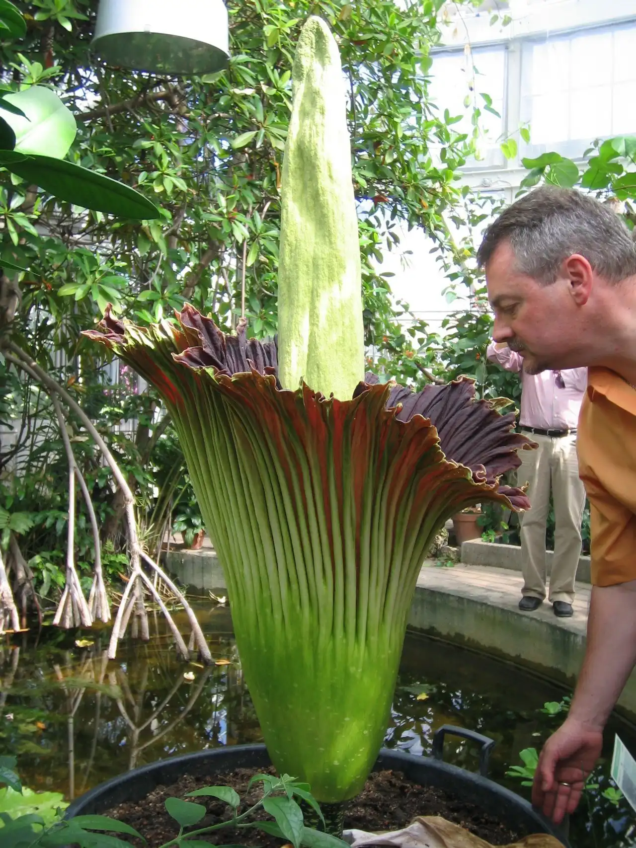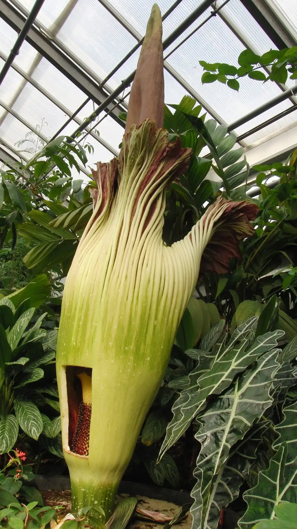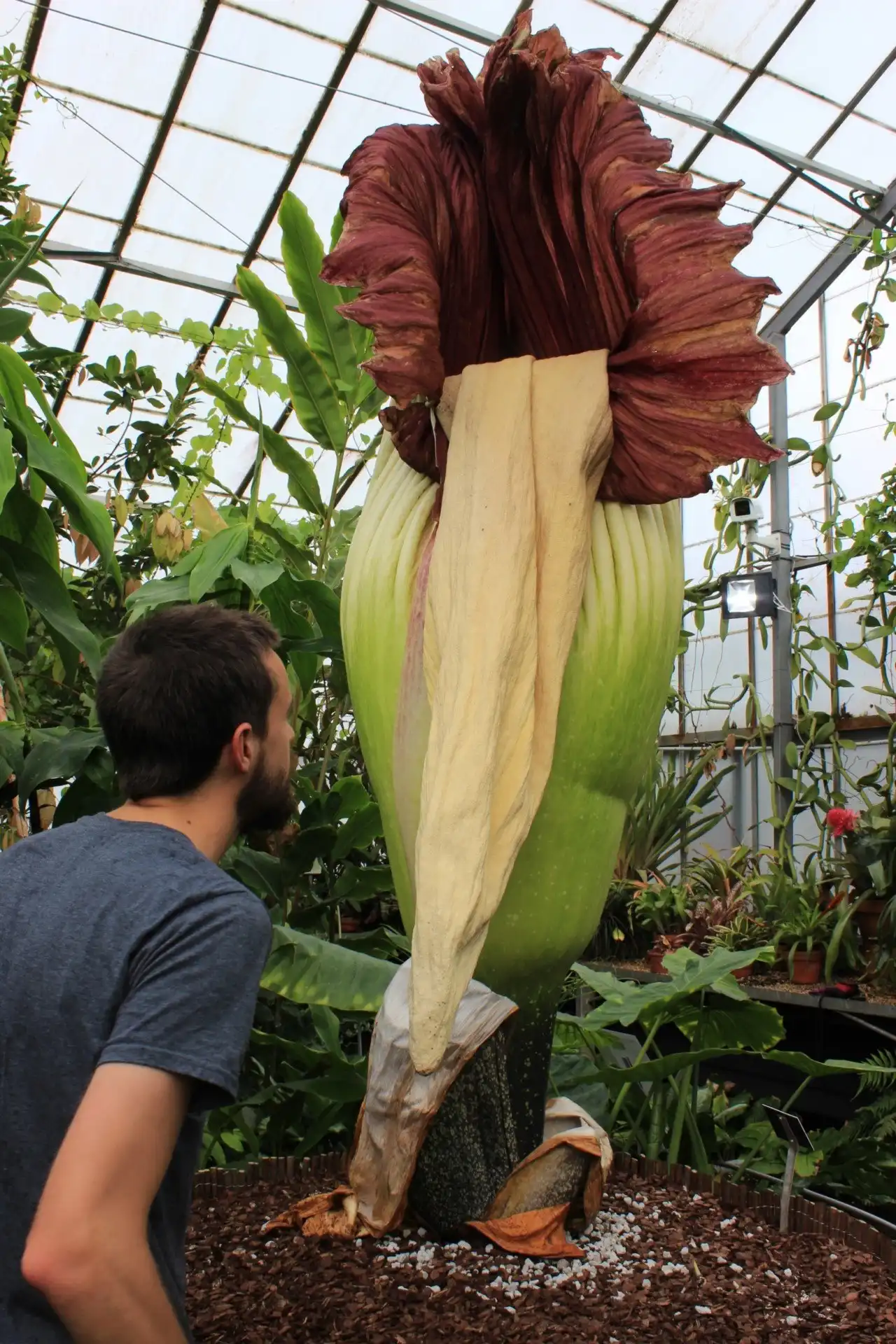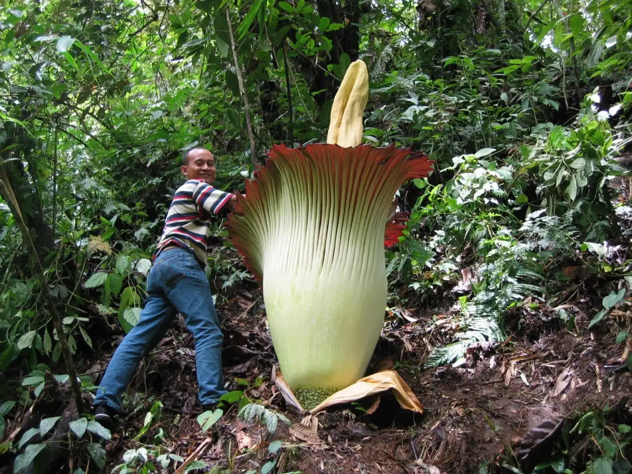 Аморфофаллус гигантский цветет всего два дня и всего пару раз за 40 лет всей своей жизни. В высоту трупный цветок может достигать более 3 м, встречаются образцы с более чем 3 м в диаметре, а самый большой вес клубнелуковиц составляет около 90 кг. Само по себе растение не очень привлекательно, ни на вид, ни на запах.