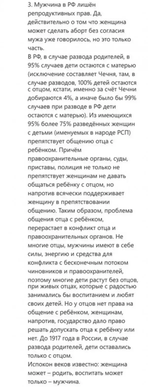 Вот про аборты согласен шопесец. Хочу ляльку, а баба ни в какую, и аборт уже сделала. И каждый раз отмазы лепит, чтоб не рожать. А остальное - все решаемо, если мужику не дают видеться с ребенком - так пусть батрачит и х*й ей а не алименты, я лучше при встрече ребенка одену, обую и игрушек наберу.