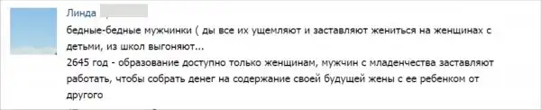 И ещё пускай женский пол идёт воевать в горячие точки, грузчиками работать, на отечественные авто пересаживаются с иномарок, и алименты выплачивают мужу))) Вот тогда будет немного похоже на равноправие.