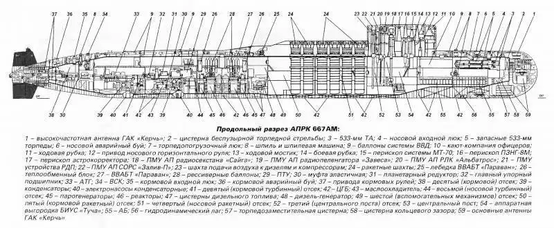 Строение АПЛ проекта 667АМ. Рисунок Апальков Ю.В.