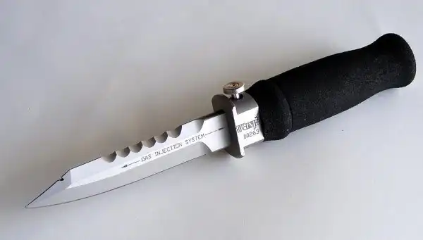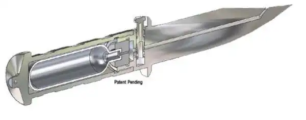 Понятно, что перед тем как нажать кнопку, нож уже должен быть в объекте. Газ попадает в тело под давлением около 55 атмосфер, разрывает внутренние органы, мышцы, ломает кости. Также, тело агрессора, за счет газа, очень быстро поднимается на поверхность воды, и уже там истекает кровью, отвлекая на себя внимание других хищников.