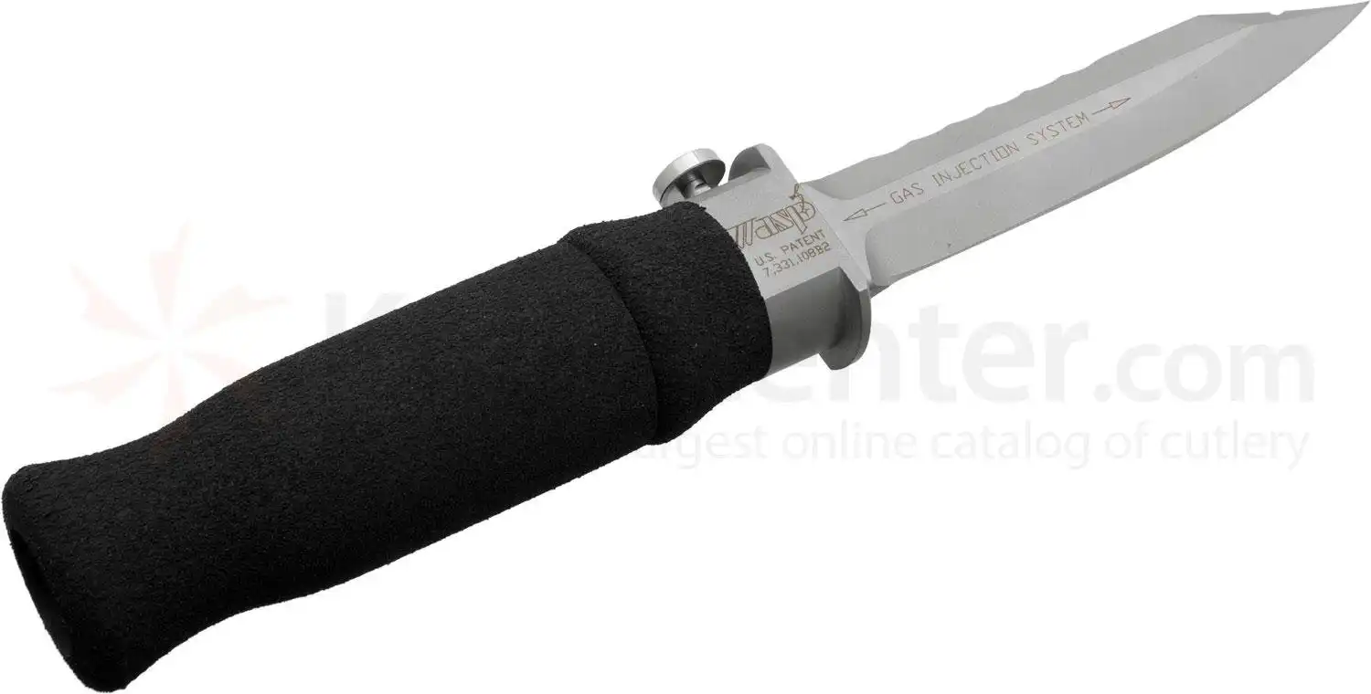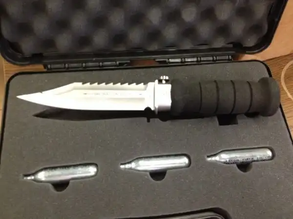 Продается нож в загадочном чемоданчике (наверное, в таком же хранят "красную кнопку"), где, помимо самого ножа, содержатся еще три баллона со сжатым газом. Выглядит комплект весьма серьезно и необычно. Стоимость его тоже довольно приличная – производитель продает это счастье за 500 долларов без пяти центов.