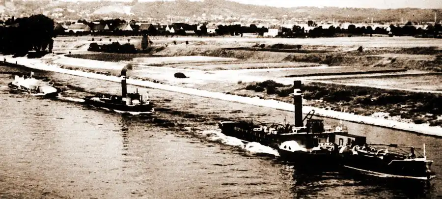 Вверху: буксировка лодок на понтонах по Эльбе; внизу: