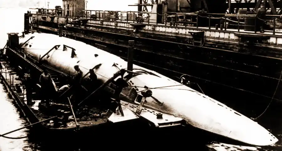 Подводная лодка типа IIB подготовлена к транспортировке по Эльбе.