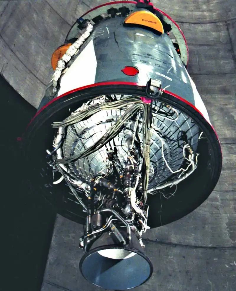 Двигатель первой ступени. В центре сопло маршевого блока,