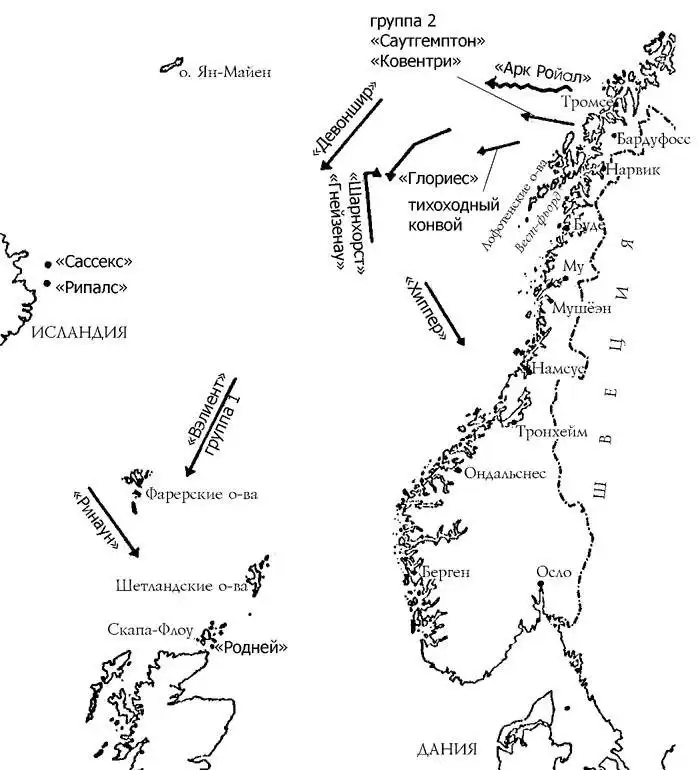 Как уже говорилось, до ночи 7/8 июня авианосцы "Ark Royal" и "Glorious" с охранением, находившиеся в оперативном прикрытии, действовали совместно севернее Andenes Point (северная оконечность Лофотенских островов). "Glorious" имел на борту 20 истребителей Королевских военно-воздушных сил (далее RAF) для транспортировки их в метрополию, а также 10 истребителей и 5 бомбардировщиков-торпедоносцев Королевских военно-воз-душных сил флота (далее FAA). "Ark Royal" и "Glorious" должны были составить часть эскортных сил второй транспортной колонны.