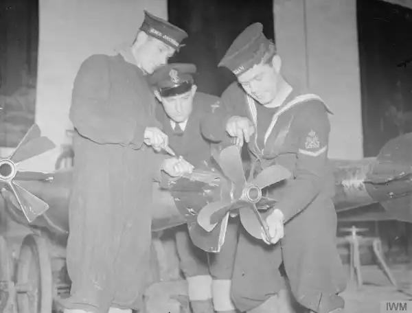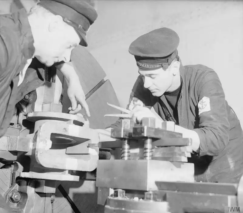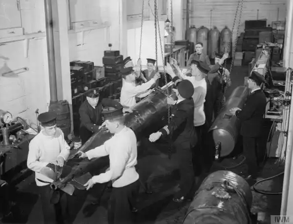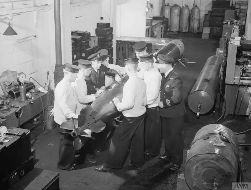 Британские военные моряки на занятиях по методам обслуживания торпед; Скапа Флоу; 1942-й год