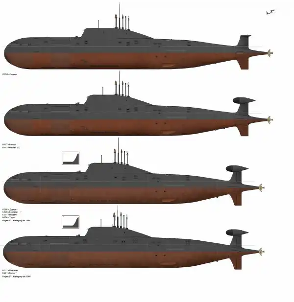 модификации проекта. Снизу вверх: 971 до 1988 года,