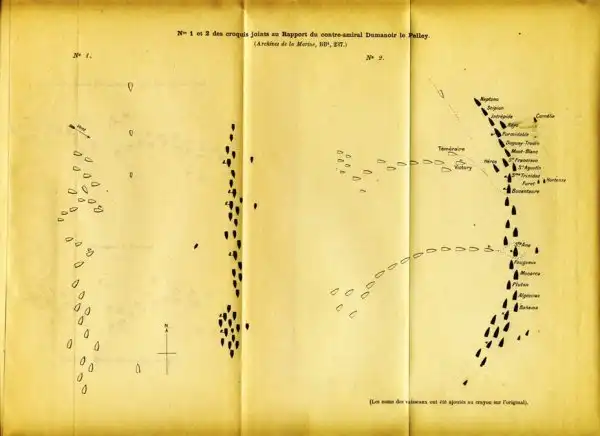 Так вот, после революции большая часть офицеров эмигрировала, а созданная система подготовки развалилась, Артиллерийский Морской корпус был распущен и закрыт как рассадник монархизма, а на место прежних капитанов пришли бывшие моряки торгового флота. В сложившейся ситуации французы проводить сложные тактические манёвры, перестроения и т.д. просто не могли. Во времена Первого Консула ситуация с флотом ни на йоту не улучшилась. Наполеон вообще бросил лучшие силы флота на создание и комплектование планировавшегося им десанта на канонерках в Англию. Во флоте были более-менее подготовленные корабли, но говорить о подготовленных соединениях, способных согласованно реализовывать сложную тактику, в это время не приходится.
