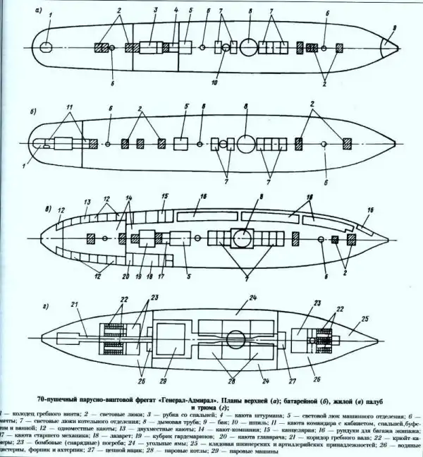 9 сентября фрегат «Генерал-Адмирал» был благополучно спущен на воду. При помощи двух американских пароходов корпус фрегата отбуксировали к доку, где его покинули приглашенные на спуск гости. Далее фрегат поставили к стенке завода «Новелти айрон уоркс» для погрузки механической установки. Что же представлял собой новый фрегат по немногочисленным сохранившимся описаниям? Он нес полное парусное вооружение и имел гребной винт, приводимый во вращение двумя паровыми машинами.