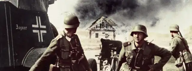 Немецкие солдаты рядом с горящей советской деревней. Время съемки: июнь 1941