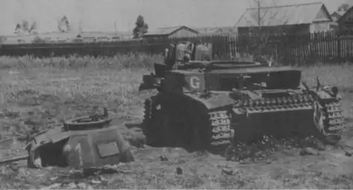 Подбитый советский танк Т-26. На башне, под крышкой люка виден сгоревший танкист. Время съемки: лето 1941