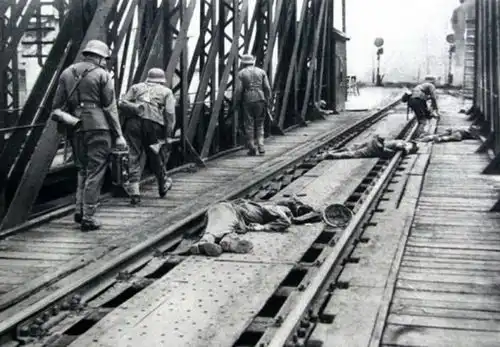 Первые советские военнопленные под наблюдением немецких солдат направляются на запад по мосту через реку Сан у города Ярослав. Время съемки: 22.06.1941