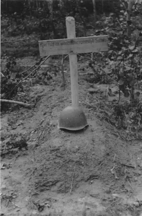 Могила советского солдата. Надпись на табличке по-немецки гласит: «Здесь покоится неизвестный русский солдат». Возможно, павший боец был похоронен своими, так в нижней части таблички можно разобрать по-русски слово «Здесь...». Немцы почему-то сделали надпись на своем языке. Фото немецкое, место съемки — предположительно Смоленская область, август 1941 года. Время съемки: лето 1941