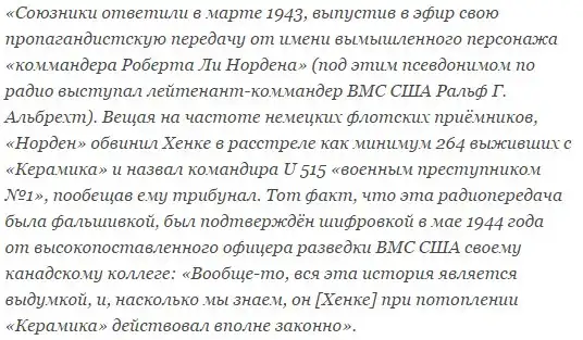 Неизвестно, насколько кривил душой адмирал Гэллери, написав о том, что англичане отрицали сам факт выхода в эфир такой передачи. Американский историк Тимоти Маллиган позже писал, что после возвращения U 515 во Францию немецкие журналисты взяли у Хенке и спасенного им Мандея интервью о «Керамике», использовав фрагменты из него в пропагандистской передаче по радио, где сообщалось об успехе немецких подводников, потопивших лайнер. Как удалось установить Маллигану, ответ на неё не заставил себя долго ждать: