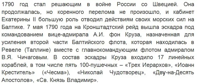 «23 мая 1790 года с полуночи. Маловетрие, погода облачная. Неприятельский флот виден под ветром. В исходе 3го часа учинен у нас сигнал, чтоб атаковать неприятеля на ружейный выстрел, а потом зделан сигнал атаковать ариергадии. В 3 часа зделан сигнал, чтоб атаковать авангардии и кордебаталии. Мы начали спускаться на неприятельскую линию и адмиральский корабль.