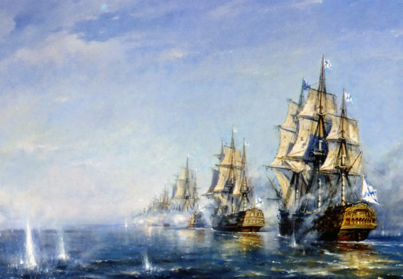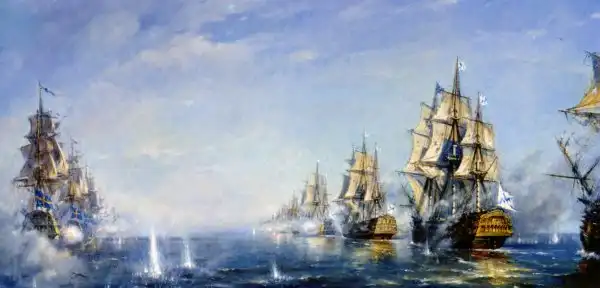 В 4 часа по приближении к неприятельскому флоту оказалось в линии оного лежащих правым галсом кораблей 22. В начале 5 часа по нашей авангардии от неприятельского вице-адмиральского корабля начали производить жесточайшую пальбу, на что от нас ответствовано».