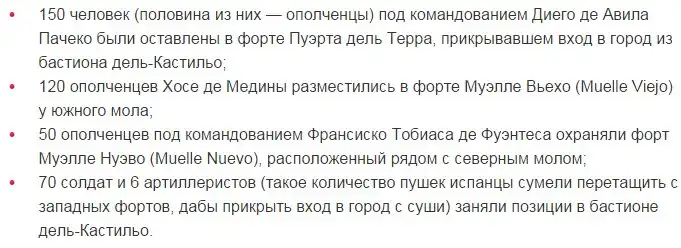 Салинес был раздражён – гарнизон крепости был мал, пушки с крошечным запасом ядер могли стрелять только в сторону моря, а моральное состояние жителей оставляло желать лучшего. Видя, что десант союзников в количестве 1800 человек высадился на перешейке, недалеко от бастиона дель-Кастильо, губернатор решил распределить свои силы следующим образом: