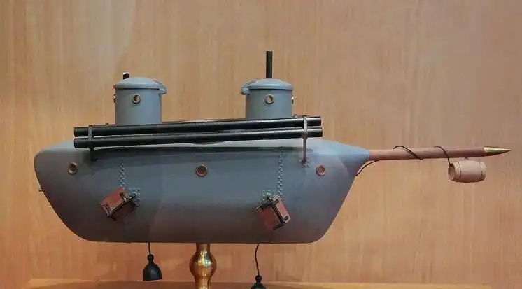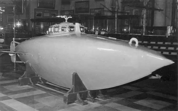 На плаву и под водой 18-тонная лодка с двумя внешними трубами для торпед продемонстрировала хорошую управляемость. Двигателя внутреннего сгорания на борту не было – и подводный, и надводный ход обеспечивался электромотором мощностью 50 лошадиных сил, а зарядка батареи – в базе. Аккумуляторной емкости хватало, чтобы на скорости 4 узла пройти 20 миль.