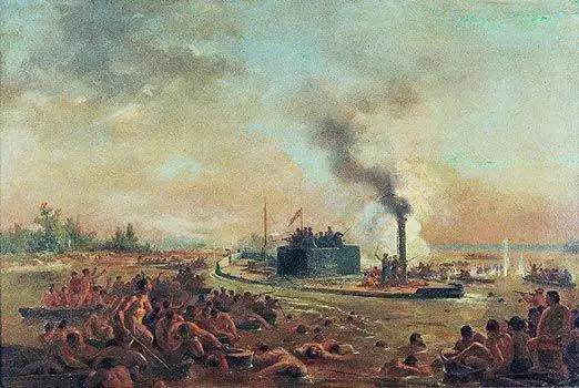 А парагвайцы монитор, как оказалось, уже ждали и решили… взять его на абордаж! Они бросились в лодки и вооруженные саблями, абордажными топорами и баграми, направились наперерез медленно идущему против течения кораблю противника. Бразильцы их заметили и тут же поспешили задраить палубные люки, а полтора десятка матросов во главе с единственным офицером – командиром корабля, выбрались на крышу орудийной башни и принялись палить по людям в лодках из ружей и револьверов. Расстояние было невелико, убитые и раненные гребцы выбывали из строя один за другим, но четыре лодки все-таки сумели настичь «Алагоас» и от 30 до 40 парагвайских солдат прыгнули к нему на палубу.