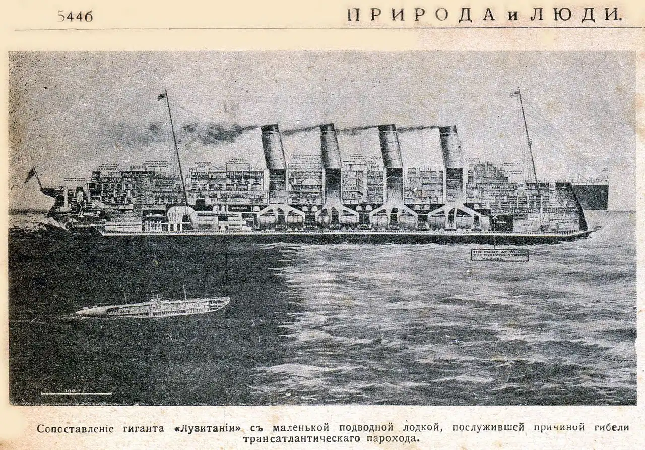 Субмарины были относительно тихоходны. Хорошим показателем в надводном положении было 15 узлов (27,8 км/час), под водой — 9 (16,7 км/час). И многие полагали, что подводные лодки не страшны судам, идущим со скоростью более 20 узлов. То, что лодки ни за кем не гоняются, а сидят в засаде в морских "угольных ушках", которые не минуешь, знали немногие, а те, кто знал, полагали, что, если быстроходное судно идет противолодочным зигзагом (постоянно в рваном режиме меняет курс), это не даст подводной лодке выйти на ударную позицию. То, что немецкие подлодки топили все больше кораблей, никого ни в чем не убеждало. Точно так же до "Титаника" относились к айсбергам. А к весне 1915 года судно вроде "Титаника" еще ни разу не становилось трофеем подводной лодки.