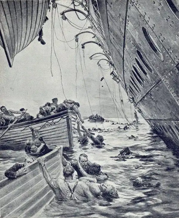 В XIX веке многие писатели обрели славу великих психологов, подробно описывая разнообразные несчастья. Здесь им было бы раздолье. "Лузитания" затонула всего за 18 минут. Температура воды была 11 градусов, люди цеплялись за все подряд, в том числе друг за друга. Тонули сотнями. Крики о помощи сливались со скрежетом разрушающегося корабля. У многих не было жилетов, у других они были надеты неправильно, и они тоже захлебывались. Одна женщина, плывшая на какой-то доске, начала рожать; музыканты, оказавшиеся в одной из шлюпок, исполняли церковные гимны...