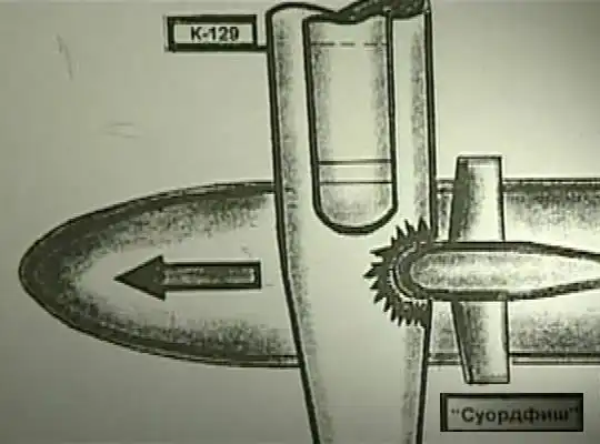 Наиболее вероятной может быть версия столкновения «К-129» с американской подлодкой «Суордфиш» (в переводе «меч-рыба»). Само ее название дает возможность представить себе строение этой подлодки, боевая рубка которой защищена двумя «плавниками», похожими на акульи. Эту же версию, по мнению ряда специалистов, подтверждают снимки, сделанные на месте гибели «К-129» с американской атомной подводной лодки «Хелибат» при помощи глубоководного аппарата. На них запечатлен корпус советской подлодки, на котором с левого борта в районе переборки между вторым и третьим отсеками видна узкая глубокая пробоина. Сама же лодка лежала на грунте на ровном киле, и это могло означать, что столкновение могло произойти под водой на глубине, безопасной для таранного удара надводного корабля. По всей видимости, «Суордфиш», следившая за советской подлодкой, потеряла гидроакустический контакт, что вынудило ее идти в точку нахождения «К-129» для восстановления контакта, но когда он появился, то времени для предотвращения столкновения уже не хватило.