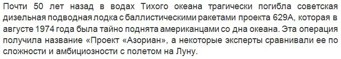 Материалы об операции ЦРУ по подъему со дна Тихого океана советской дизельной подлодки проекта 629А «К-129» с ракетным комплексом Д-4 национальный архив секретных материалов США рассекретил только 12 февраля 2010 года.