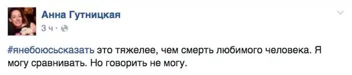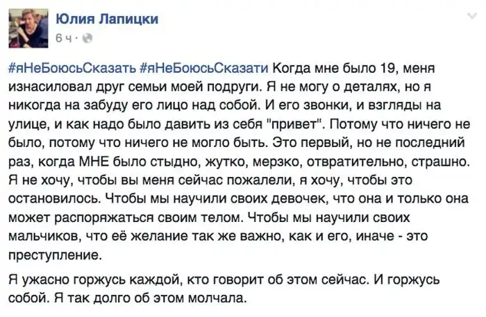 В сети набирает популярность флешмоб, запущенный под хэштегами #янебоюсьсказати и #янебоюсьсказать. По словам организатора флешмоба Анастасии Мельниченко, главы правления украинской общественной организации Studena, занимающейся социальной адаптацией военнослужащих, вопросами гендерного равенства и развитием гражданского общества, проект направлен на борьбу с дискриминацией и сексуальным насилием. За считанные дни тысячи людей из Украины и России поддержали инициативу Анастасии и стали делиться собственными историями из жизни. Пользователи сети рассказывали о сексуальных насилиях и домогательствах, признаваясь в том, что им до сих пор стыдно рассказывать о произошедшем.