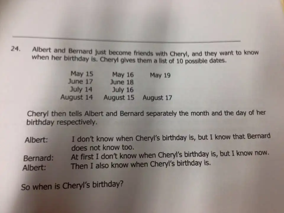 Альберт и Бернард только что познакомились с Шерил. Они хотят знать, когда у неё день рождения. Шерил предложила им десять возможных дат: 15 мая, 16 мая, 19 мая, 17 июня, 18 июня, 14 июля, 16 июля, 14 августа, 15 августа и 17 августа. Затем Шерил сказала Альберту месяц своего рождения, а Бернарду — день. После этого состоялся диалог.
