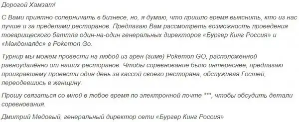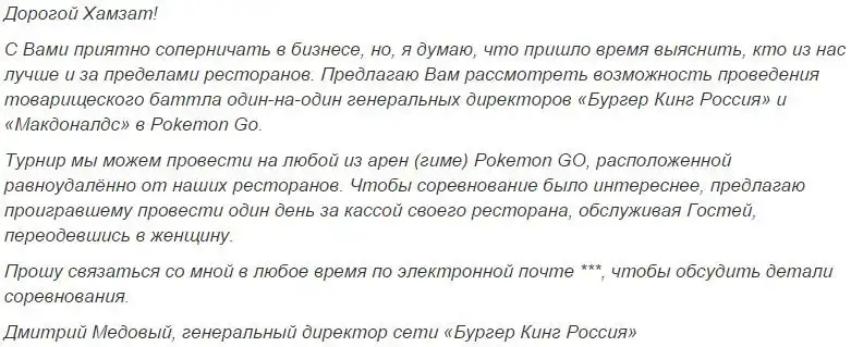 Глава российского представительства Burger King Дмитрий Медовый предложил главе McDonalds Хамзату Хабулатову провести товарищескую дуэль в игре Pokemon Go, проигравший должен будет надеть женскую одежду и отработать день за кассой ресторана.